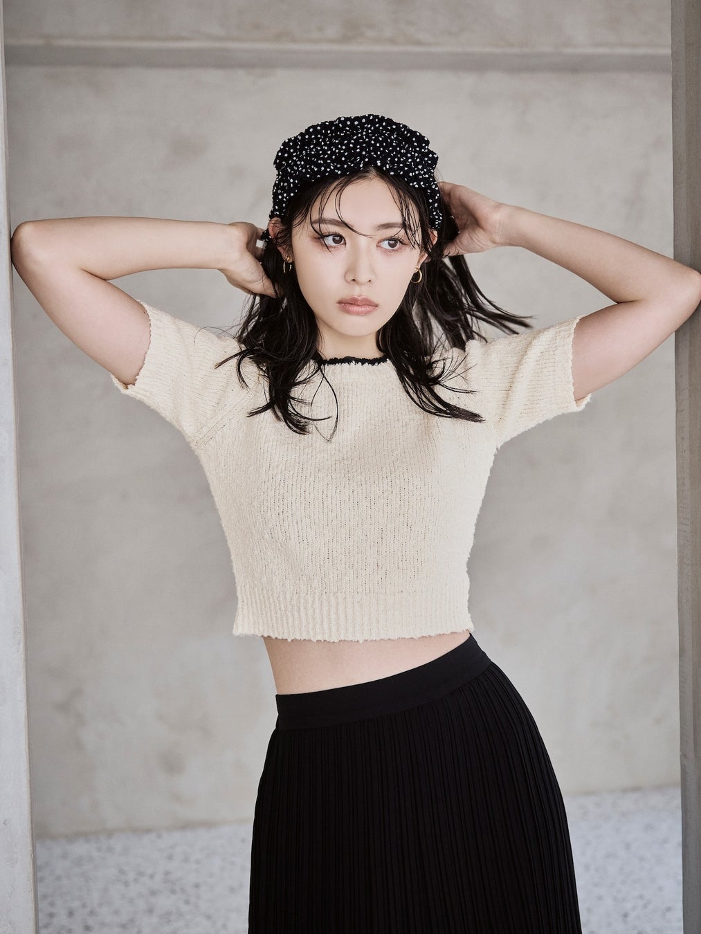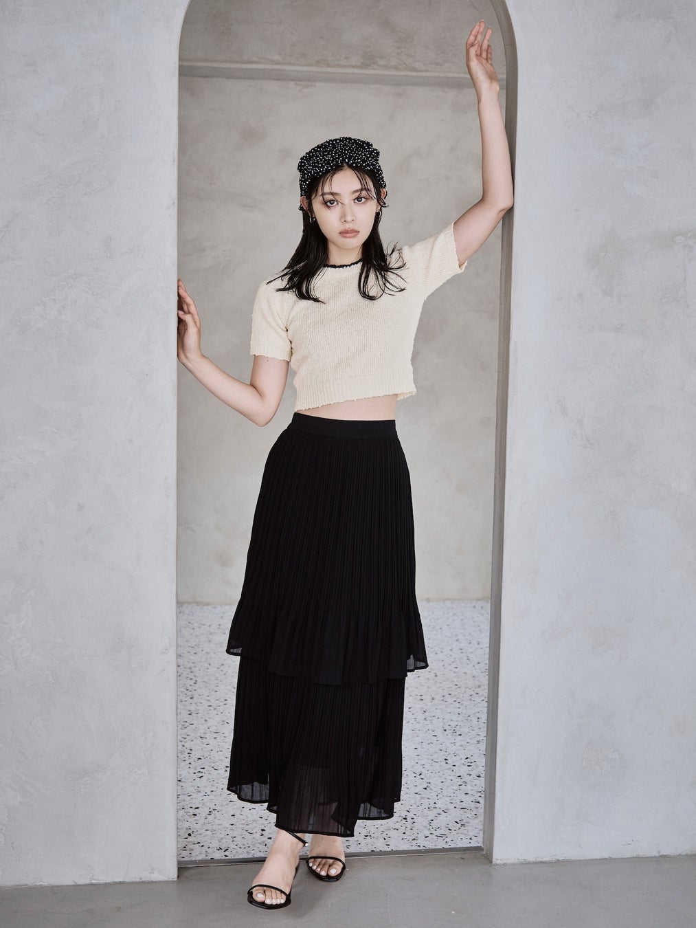 •配色サマーニット: アイボリー ¥6,710(税込) •プリーツティアードスカート: ブラック ¥6,710(税込)