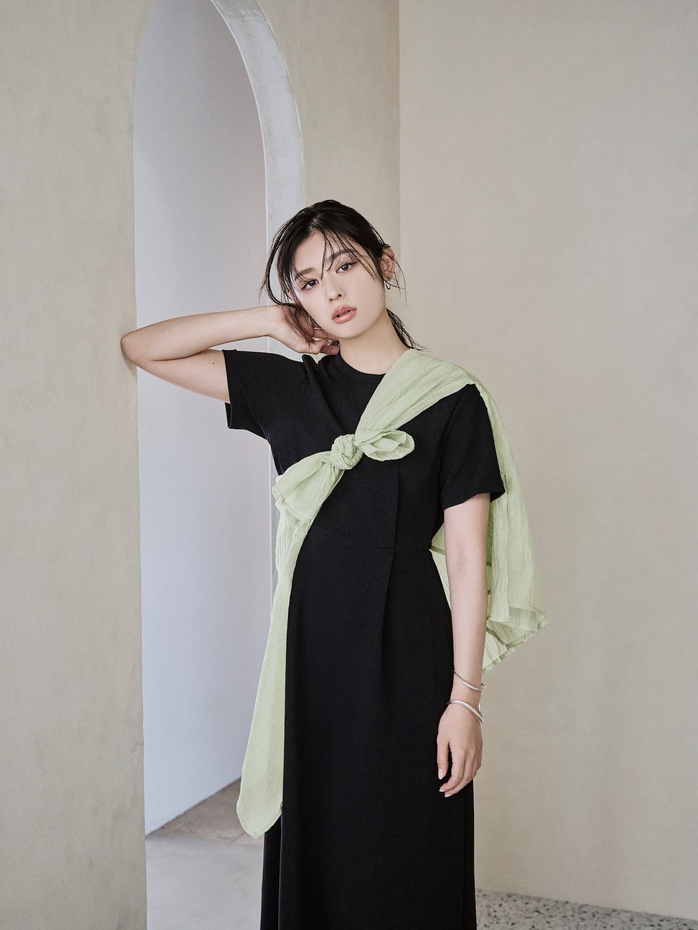 •バックスリットシアーシャツ: グリーン ¥5,759(税込) •ウエストタックカットワンピース: ブラック ¥5,759(税込)