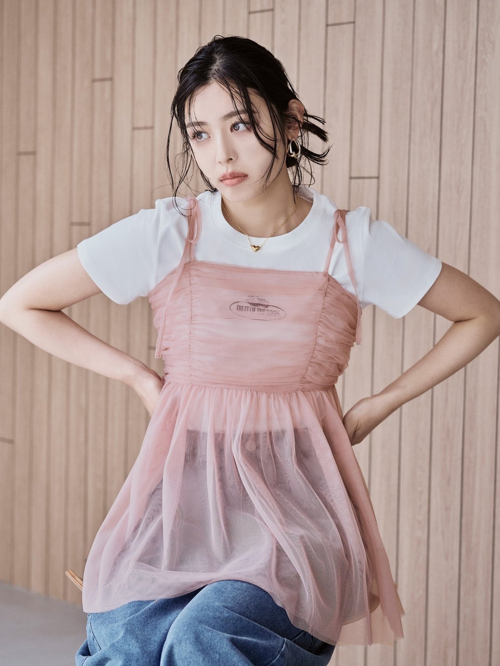 ワイド×カーゴデザインのトレンドが詰まったデニムパンツ。胸元のフルーツロゴ刺繍がポイントのシンプルTシャツに透け感のあるチュール素材が華やかなキャミソールを合わせ遊び心をプラス