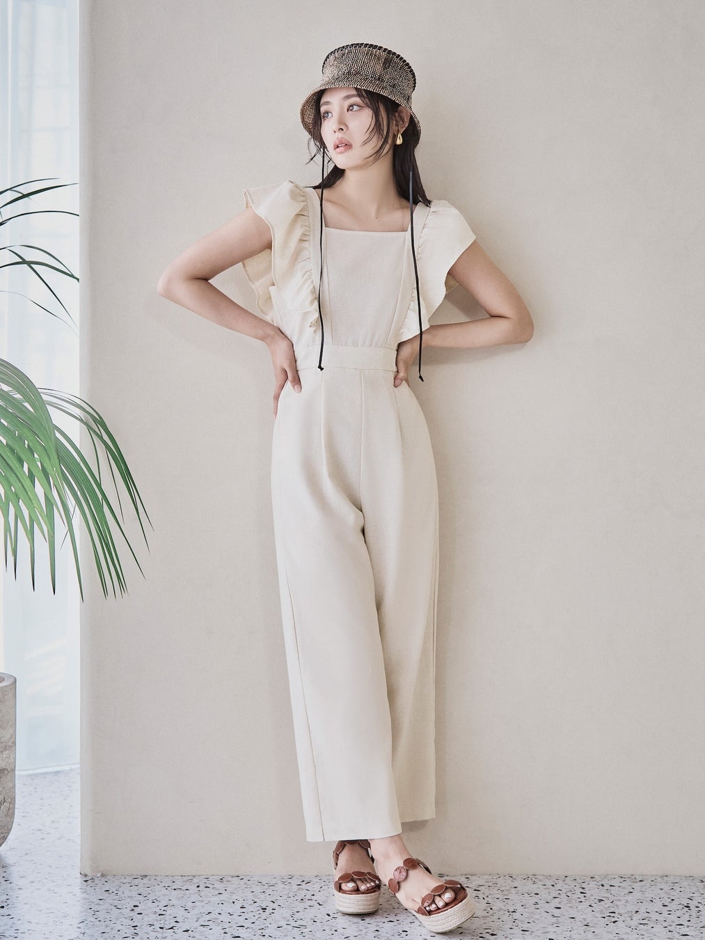 大ぶりなフリルが目を惹くオールインワン。後ろ姿まで可愛いバックリボンがポイント。