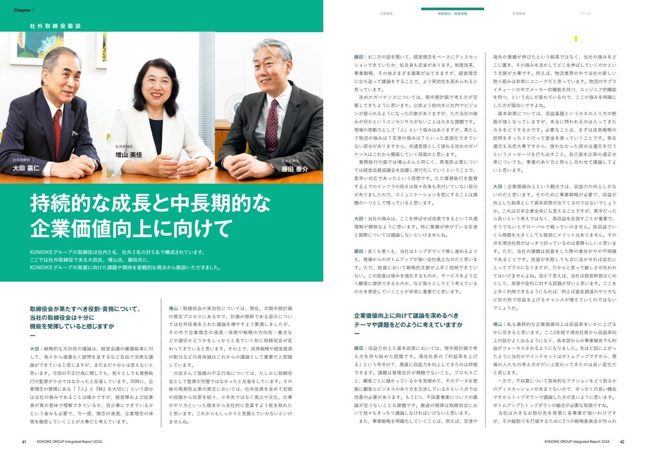 社外取締役である大田氏、増山氏、藤田氏に、KONOIKEグループの発展に向けた課題や期待を