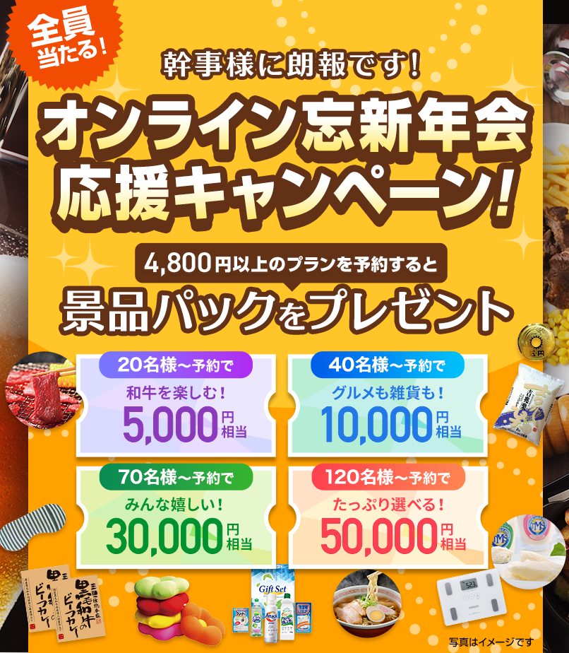 【まだ間に合う!忘新年会】20名様以上で「もれなく景品パックを無料プレゼント!」オンライン忘新年会応援キャンペーンを2023年2月10日まで実施