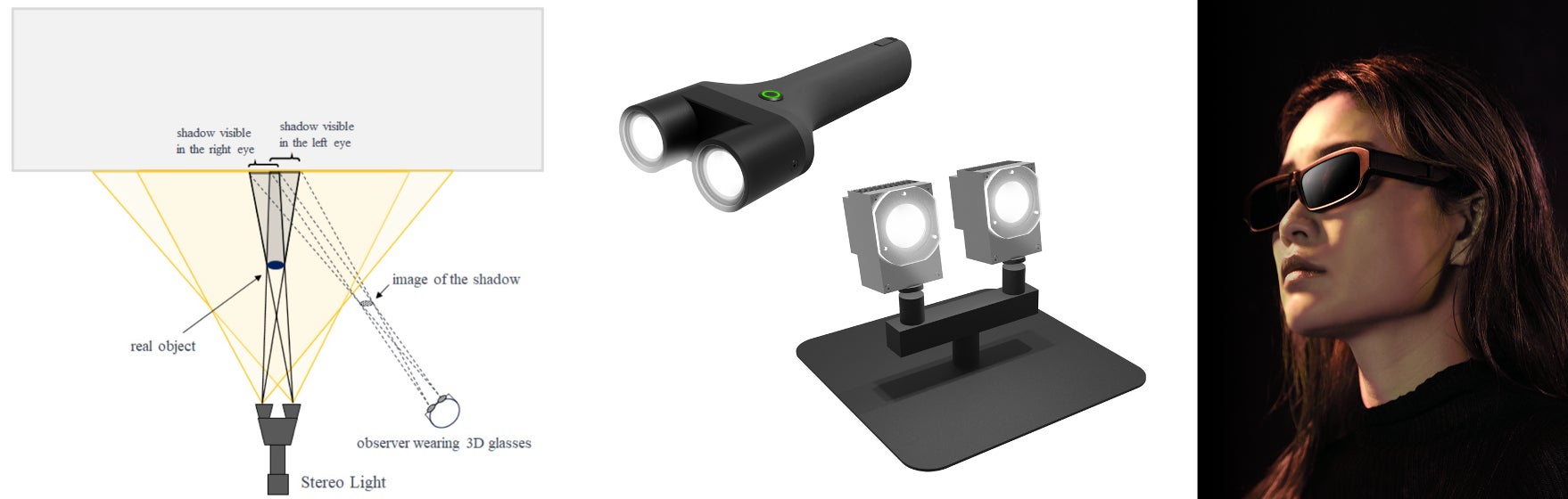「ステレオライト™」は、アブストラクトエンジンが独自開発した二眼投光器、およびその発光をアクティブシャッター方式の3Dメガネと同期させるシステムのこと。ステレオライト™が生み出す影、反射光や透過光は3Dメガネ越しに見ると左右の目に異なる像となって映り、空中で結像するため、光や影が空間に浮き上がって見える没入的な視覚体験を生み出すことができる。2023年に発表した「”Syn : 身体感覚の新たな地平” by Rhizomatiks x ELEVENPLAY」で初披露されたオリジナルシステムである。