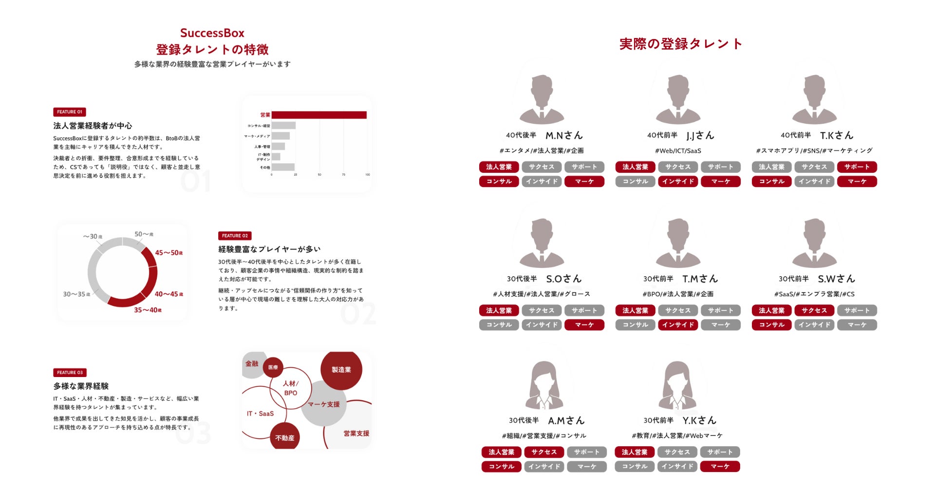 登録人材のスキルや経験を可視化し、市場ニーズに即したレベル感を具体的に開示しました。BtoB営業に精通した30〜40代の経験豊富な人材が中心で、折衝から合意形成まで完結できる推進力が強みです。多様な業界知見を活かした現場の立て直しから、高度な戦略立案まで、期待値に合わせた柔軟なアサインが可能です。