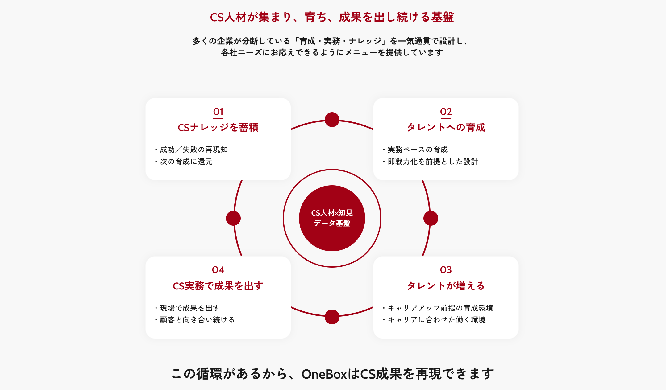 OneBoxが提供するSuccessBoxは、カスタマーサクセス(CS)における人材課題を包括的に解決するトータルソリューションです。「ナレッジの共有・教育・成果」が循環する独自の育成エコシステムを構築。 成長意欲の高い人材が集まる魅力的な環境を土台に、以下の3つのアプローチで最適な解決策を提案します。