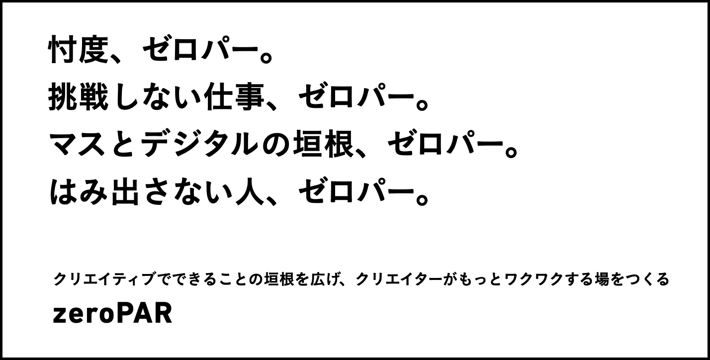 「忖度、ゼロパー。挑戦しない仕事、ゼロパー。マスとデジタルの垣根、ゼロパー。はみ出さない人、ゼロパー。」をスローガンに、若きクリエイターの才能を活用できる場を創出します。