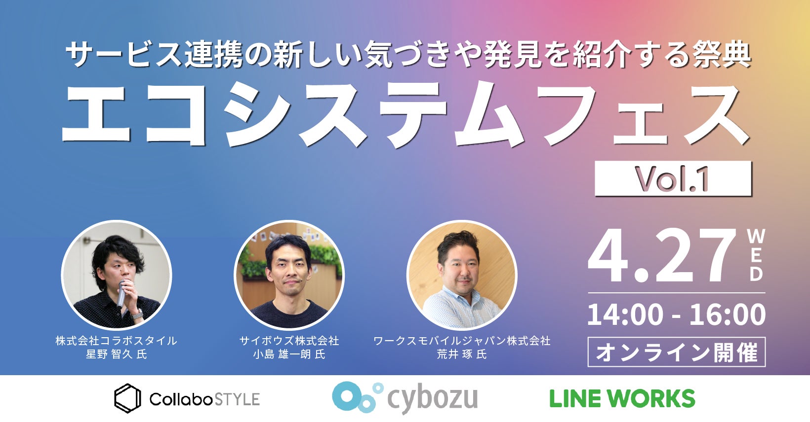 ワークスタイルの未来を切り拓くことを目的にクラウドサービス「コラボフロー」を提供する株式会社コラボスタイル(所在地:愛知県名古屋市、代表取締役社長:松本 洋介、以下 コラボスタイル)は、「kintone」を提供するサイボウズ株式会社(所在地:東京都中央区、代表取締役社長:青野 慶久、以下 サイボウズ)、「LINE WORKS」を提供するワークスモバイルジャパン株式会社(所在地:東京都渋谷区、代表取締役社長:福山 耕介、以下 ワークスモバイルジャパン)と共同で2022年4月27日に「エコシステムフェスVol.1」をオンライン開催します。
