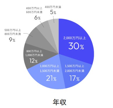 WHITE CROSS会員の属性データとして、30%が年収2,000万円、さらに68%が年収1,000万円と高く、歯科医師ユーザーに占める富裕層の割合が高くなっております。