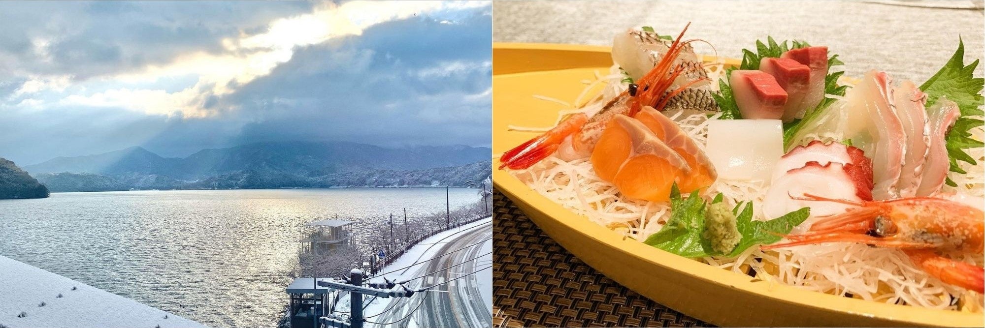▶『湖上PAMCO』の部屋から見える水月湖。夕食は料理長特製の海鮮料理。