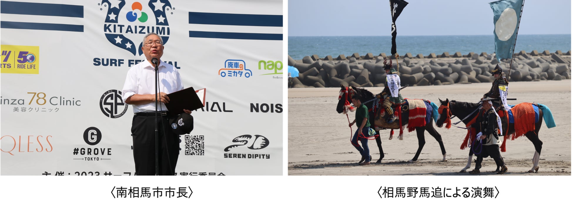 こうして北泉の地で「KITAIZUMI SURF FESTIVAL 2023」を盛大に開催できましたことを関係者の皆様にお慶び申し上げます。この北泉は、震災前から国際大会も開かれるようなサーフィンの非常に盛んな土地でした。しかし、東日本大震災で地形が変わったり、さまざまな問題があったりと、しばらく開催できなかったなかで、震災後はじめて多くの皆様をお迎えしての国際的な大会を開催できたことは本当に感無量であります。また大会では、子供たちのサーフィン教室の開催や、相馬野馬追の関係の登壇、甲冑の着付け体験、乗馬など、非常に多くのイベントを盛りだくさんに企画していただいたことにあらためて深く御礼申し上げます。あらためて今回を機にこうした国際的な大会が今後も継続されるよう努力してまいります。