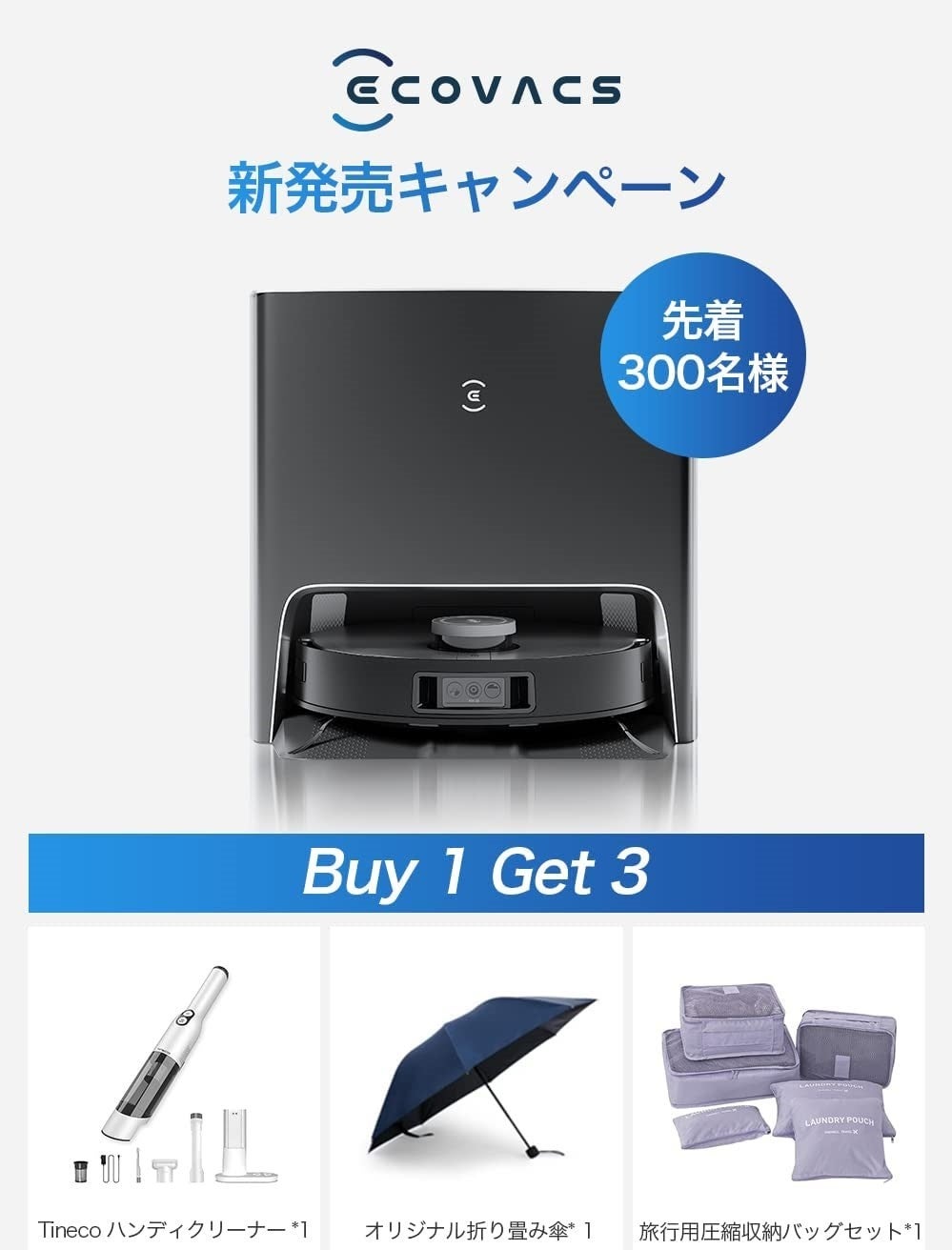 エコバックスジャパン公式アマゾンストアでDEEBOT X1 TURBOを1台以上購入すると、先着で300名にハンディクリーナー、ECOVACSオリジナルの折り畳み傘、旅行用の圧縮収納バッグを無料でプレゼントいたします。
