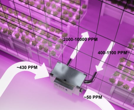 本製品は、空気中から直接CO2を回収し、温室や植物工場でそのまま再利用できる革新的な技術を採用しています。熱交換機能やCO2再循環機能を備えて、環境負荷・電力使用量を抑えた省エネ設計が特徴です。設定したCO2濃度(ppm)に応じて自動制御を行い、安定した供給を可能にします。化石燃料や液体ガスを使用せずにCO2を生成できるため、調達にかかるランニングコストを大幅に削減可能。脱炭素化を目指す事業者にも最適です。