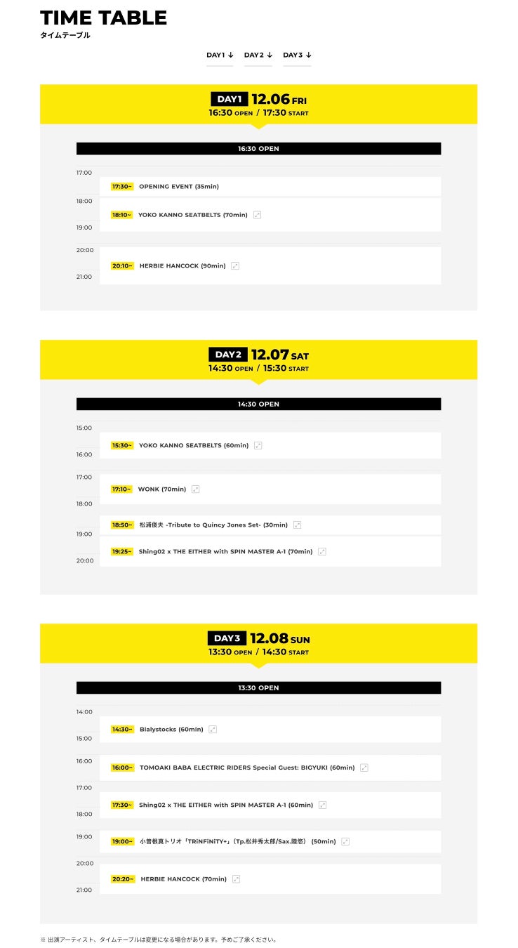 12/6(金)は、菅野よう子率いるYOKO KANNO SEATBELTS、米音楽界のレジェンド、ハービー・ハンコック 。12/7(土)は、YOKO KANNO SEATBELTS、WONK、クインシー・ジョーンズトリビュートを披露する松浦俊夫、そしてShing02×THE EITHER<ザ・イーザー>。最終日は、Bialystocks、TOMOAKI BABA ELECTRICRIDERS、小曽根真トリオ、そしてハービー・ハンコックがおおとりを飾ります 。どのアーティストも出演時間は1時間前後にわたり見応えは十分。加えて、サブステージの出演アーティストも続々と決定。須永辰緒を筆頭に、SOIL&“PIMP”SESSIONSの社長、Naz Chris、Koko、SHIMA SHUNら豪華DJ陣が登場します。
