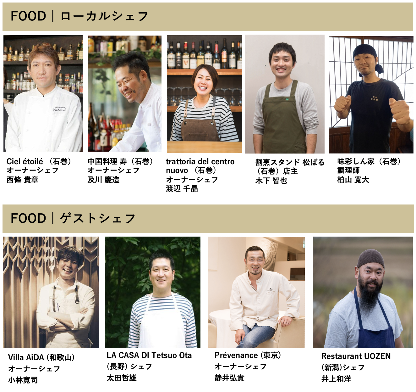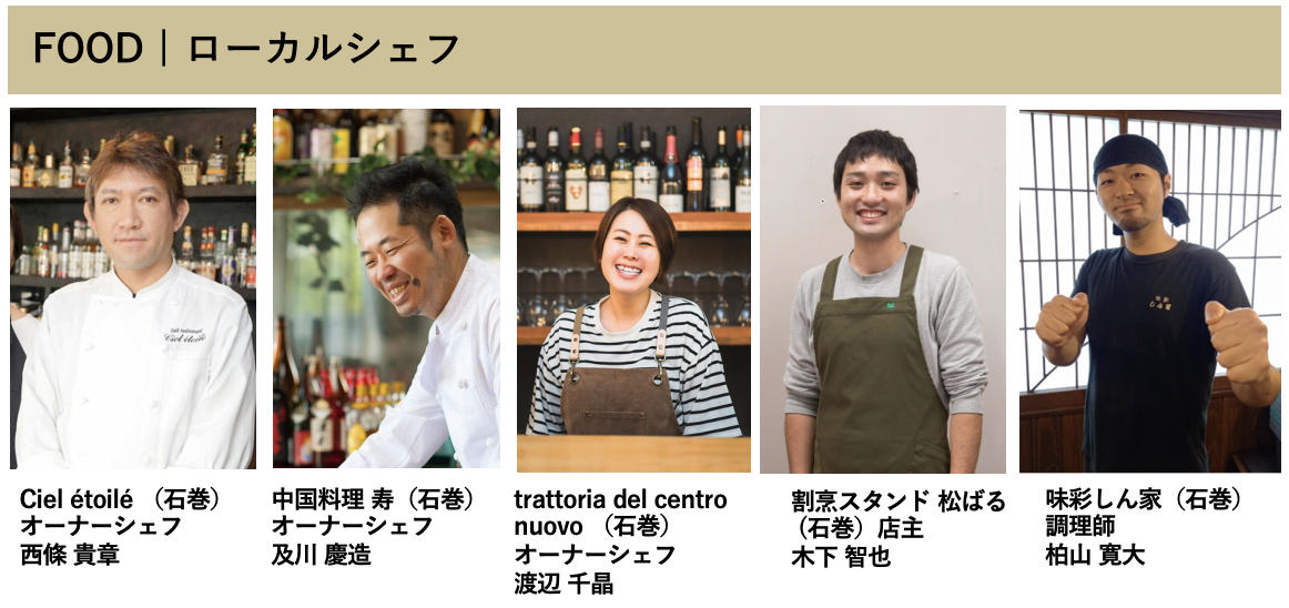 ⽯巻の料理⼈を中⼼に、これまでリボーンアート・フェスティバルに関わってくれた、時代を代表する⾷のクリエイターたち。そこに新たに才能豊かなシェフたちが加わり、新しいリボーンアート・フードセッションを奏でます。