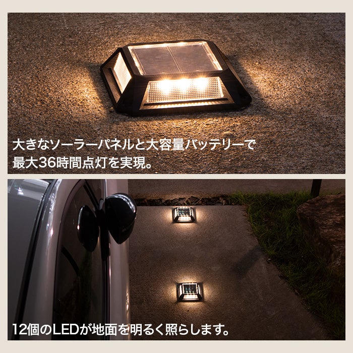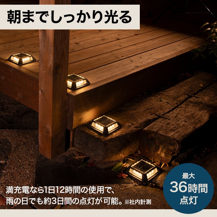 満充電で連続36時間点灯します。ソーラーパネルの面積が広く、大容量バッテリーを使用。最大まで充電すれば、曇りや雨の日など充電できない日が続いても約3日間点灯可能。12個のLEDが朝までしっかりと照らします。