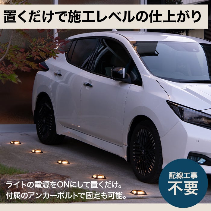 ライト本体の電源をONにして置くだけ。アルミ合金製のフレームなので外構との相性が良く、置くだけで施工レベルの外観になります。固定が必要の際も、付属のアンカーボルトの使用で固定可能です。