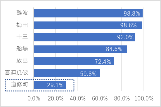 道修町を「どしょうまち」と正しく読めた方は29.1%と今年も低水準で、正答率が最も高い大阪府に限っても、その割合は36.5%でした。