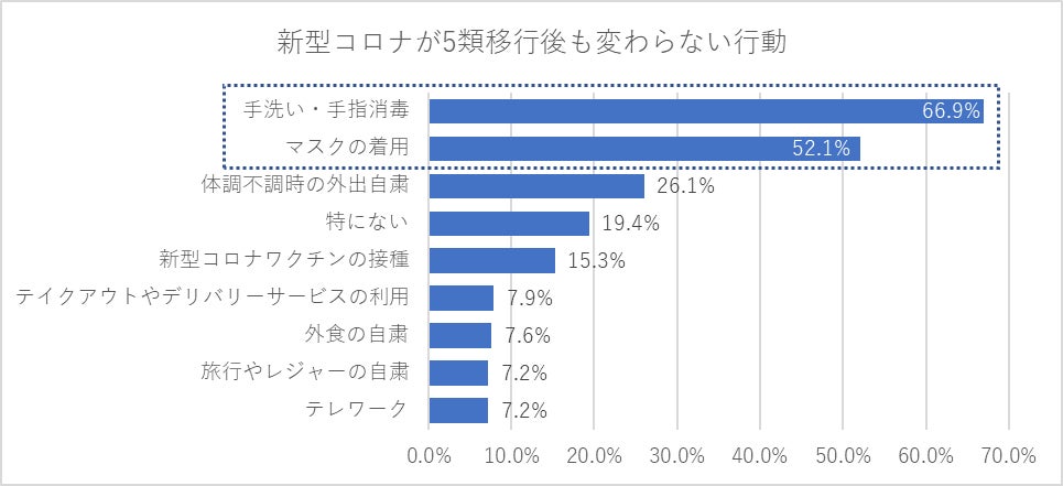 5類移行後も変わらない行動の上位に挙げられたのが、手洗い・手指消毒やマスクの着用で、40歳以上は半数以上がマスク着用を継続するなど、衛生意識の定着がうかがえました。