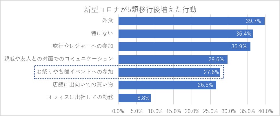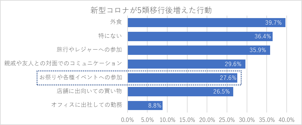 5類移行後に増えた行動に「お祭りなどのイベント参加」を挙げた方は27.6%で、30歳代の40.9%を筆頭に、40歳代の32.7%、20歳代の24.0%、50歳代の23.6%、60歳代の16.8%と続きました。一方で、すべての年代で1/3以上が行動に変化は「特にない」と答え、5類移行後も日常生活にコロナ禍の影響が残る様子が現れました。