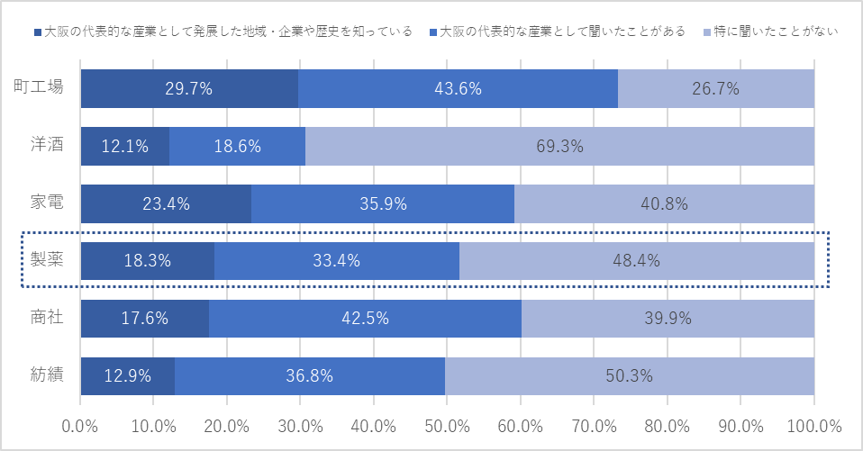 3.大阪の代表的な産業(紡績、商社、製薬、家電、洋酒、町工場)に対する認知の割合