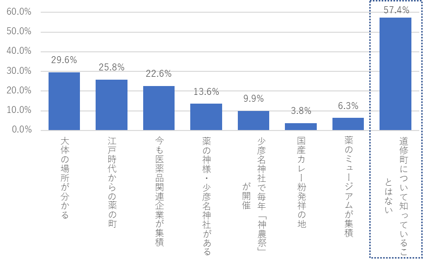 道修町を現役の「くすりの町」と認識する割合と、「くすりの神様」を祀る少彦名神社を認識する割合が、それぞれ22.6%と13.6%と、2016年の調査開始以来最も低い数値となり、「道修町について知っていることはない」の回答が、昨年に続き過去最多を更新しました。