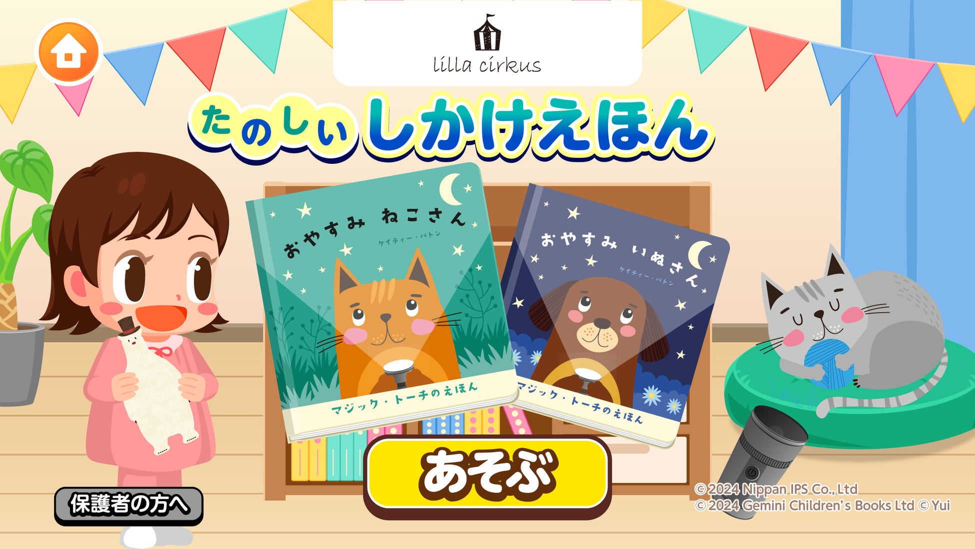 「たのしい しかけえほん」は、世界累計売上70万部以上のしかけ絵本『マジック・トーチのえほん』シリーズである『おやすみ いぬさん』と『おやすみ ねこさん』のストーリーに沿って、暗闇の中の動物達をマジック・トーチで照らす“しかけ”を体験できるゲームです。