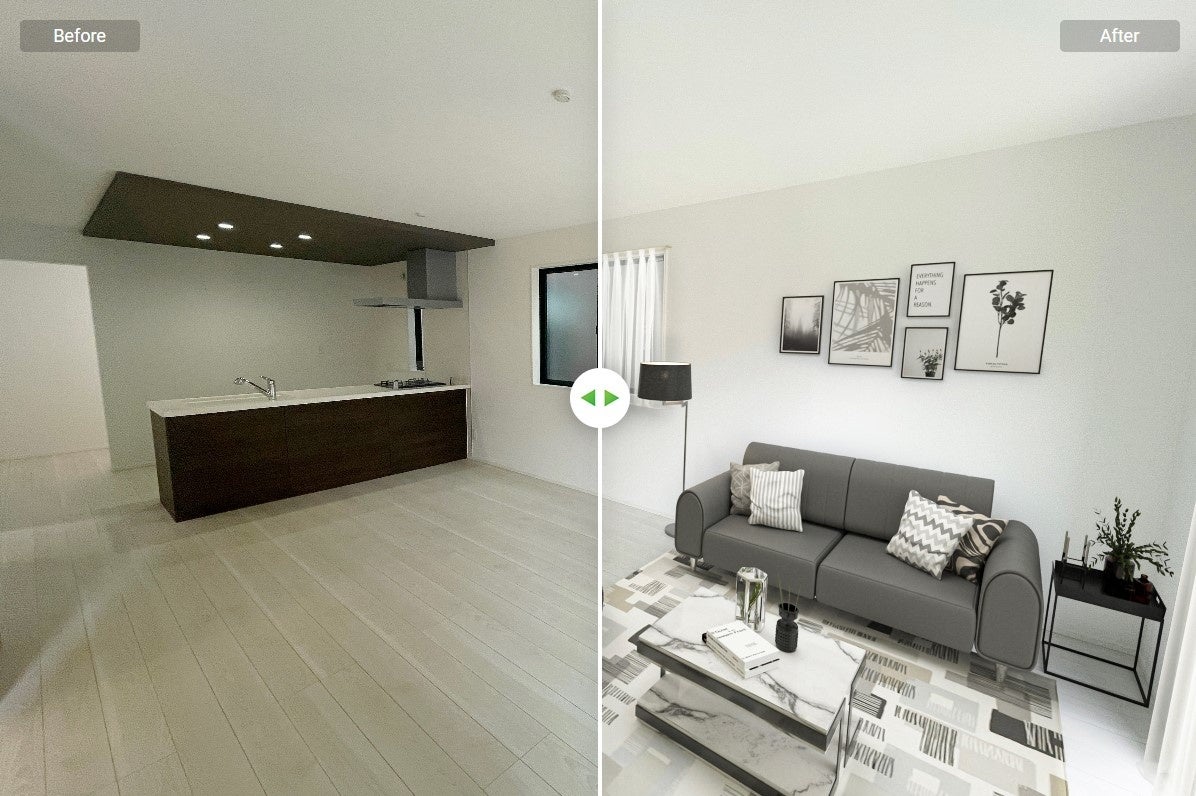ラストマイルワークスが提供するバーチャルステージングサービスは売主さまが居住中で家具などが写り込んでいる写真でも、最新のCG技術を用いて家具を消し、リフォームしたイメージ画像を作成することが可能です。