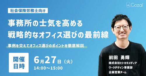 そこで今回は、多くの企業のオフィス移転を支援されている株式会社ヒトカラメディアの前田勇輝さまを講師でお招きして、社会保険労務士のためのオフィス選びのポイントについて徹底解説していただきます。