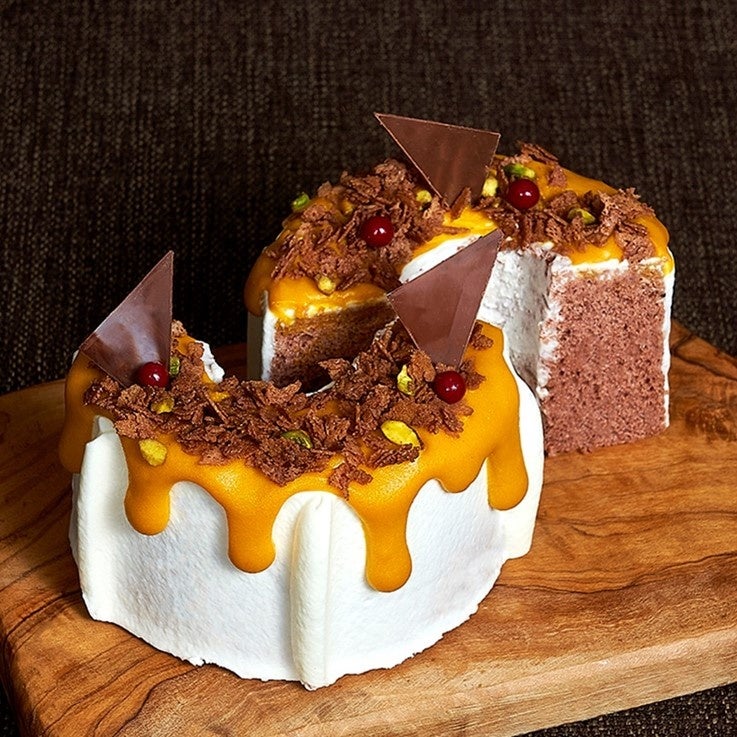 カカオの苦味と香り高いチョコレートのシフォン生地に、まろやかな甘みのパンプキンソースを合わせました。ソースの隠し味にはホワイトチョコレートとバニラの香りをプラスし、しっとり濃厚な味わいが広がります。