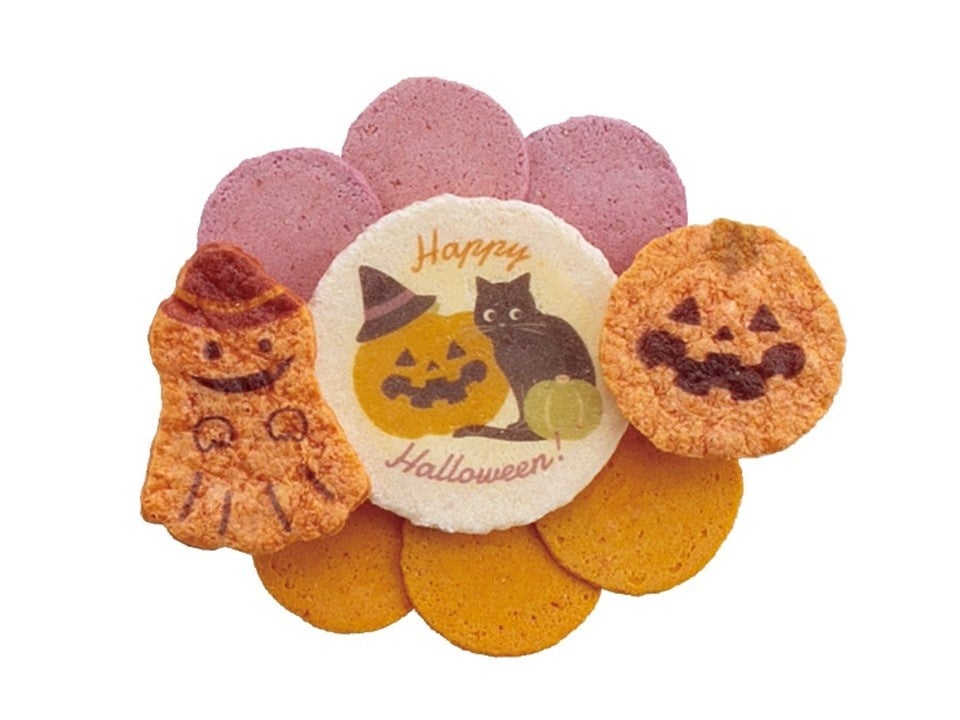 ハロウイーンにちなんだかぼちゃ味や紫芋味のえびせんべい、お化けやかぼちゃお化け型のえびせんべい、1袋でいろいろな味をお楽しみいただけます。