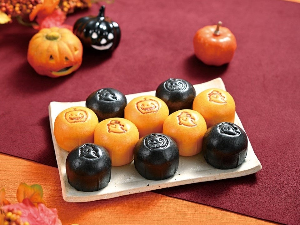 黒く仮装した「シウマイまん」と、ほっくり甘いかぼちゃあんを包み込んだ「かぼちゃまん」です。かぼちゃとお化けの焼き印もお楽しみください。