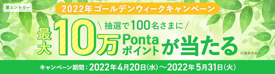 auフィナンシャルサービスは、2022年4月20日から2022年5月31日までの間、エントリーのうえ「au PAY カード」「au PAY ゴールドカード」を5,000円以上ご利用いただくと、抽選で100名さまに期間中のご利用金額全額相当のPontaポイント(上限10万円分)を還元するゴールデンウィークキャンペーンを実施します。