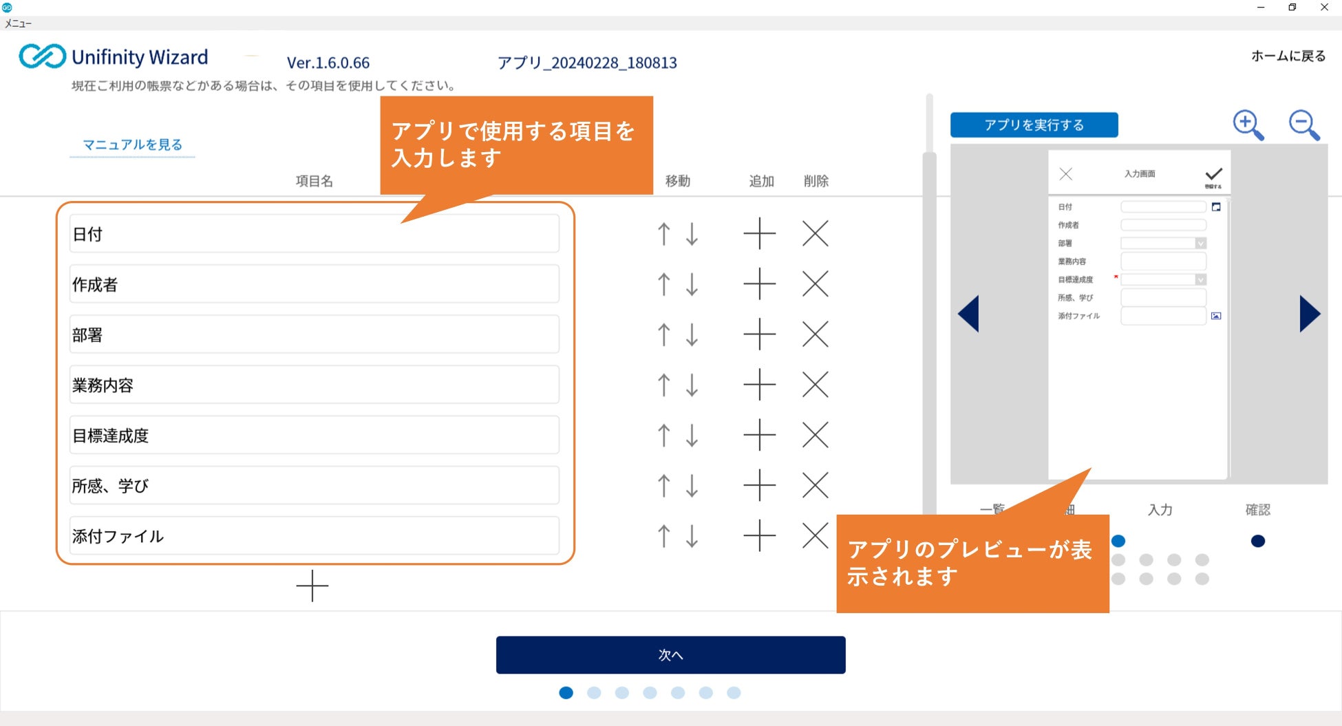 Unifinity Wizard Ver1.6では、アプリで利用したい項目を設定するだけで、便利なモバイルアプリを自動で生成できます。