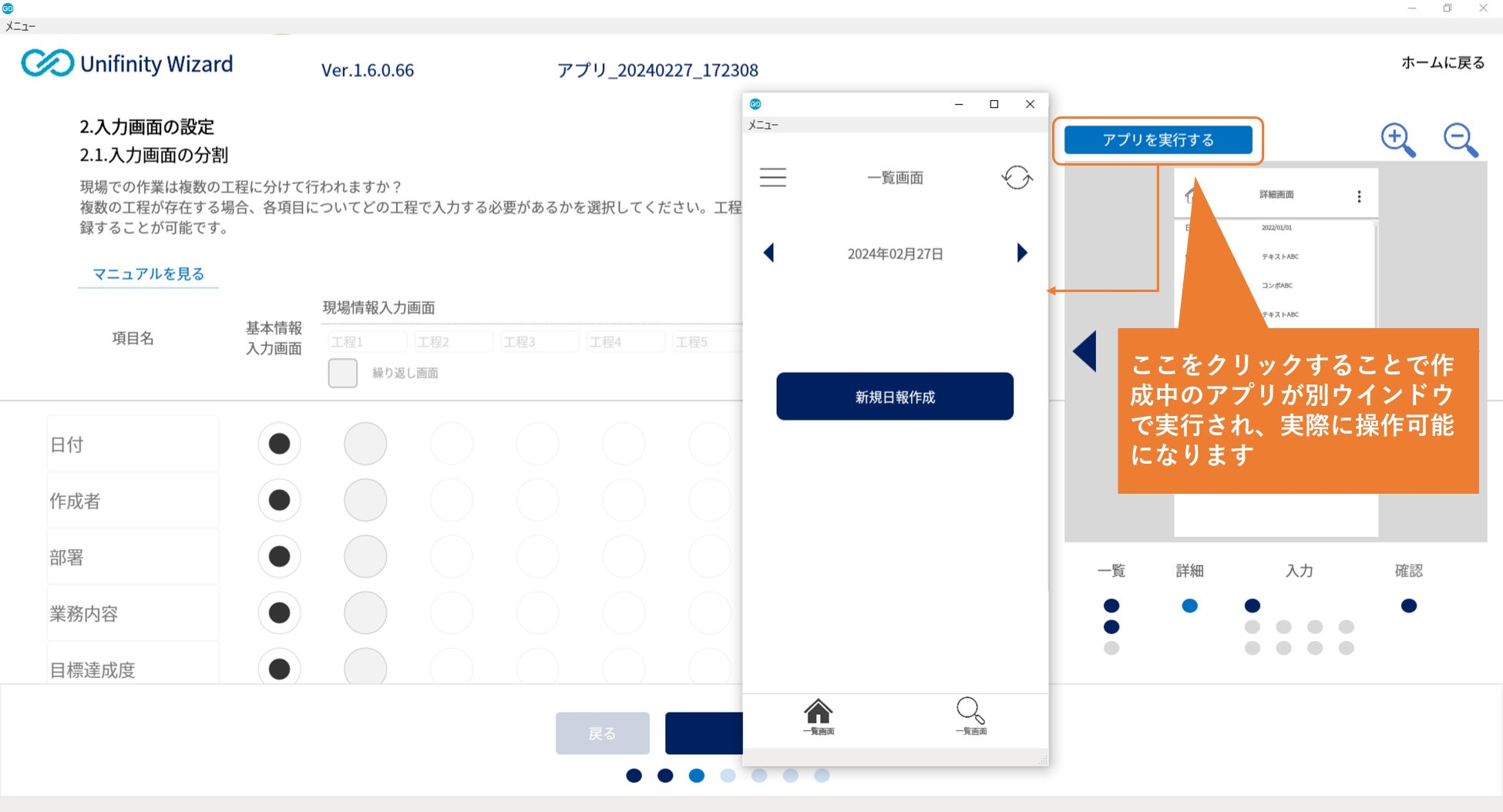 プレビュー画面上部の「アプリを実行する」ボタンを押すと、その時点で設定した内容をもとに残りの設定をAIが推測し、アプリを自動で生成します。出来上がったアプリを確認しながら設定を調整することで、思い通りのアプリに仕上げることができます。
