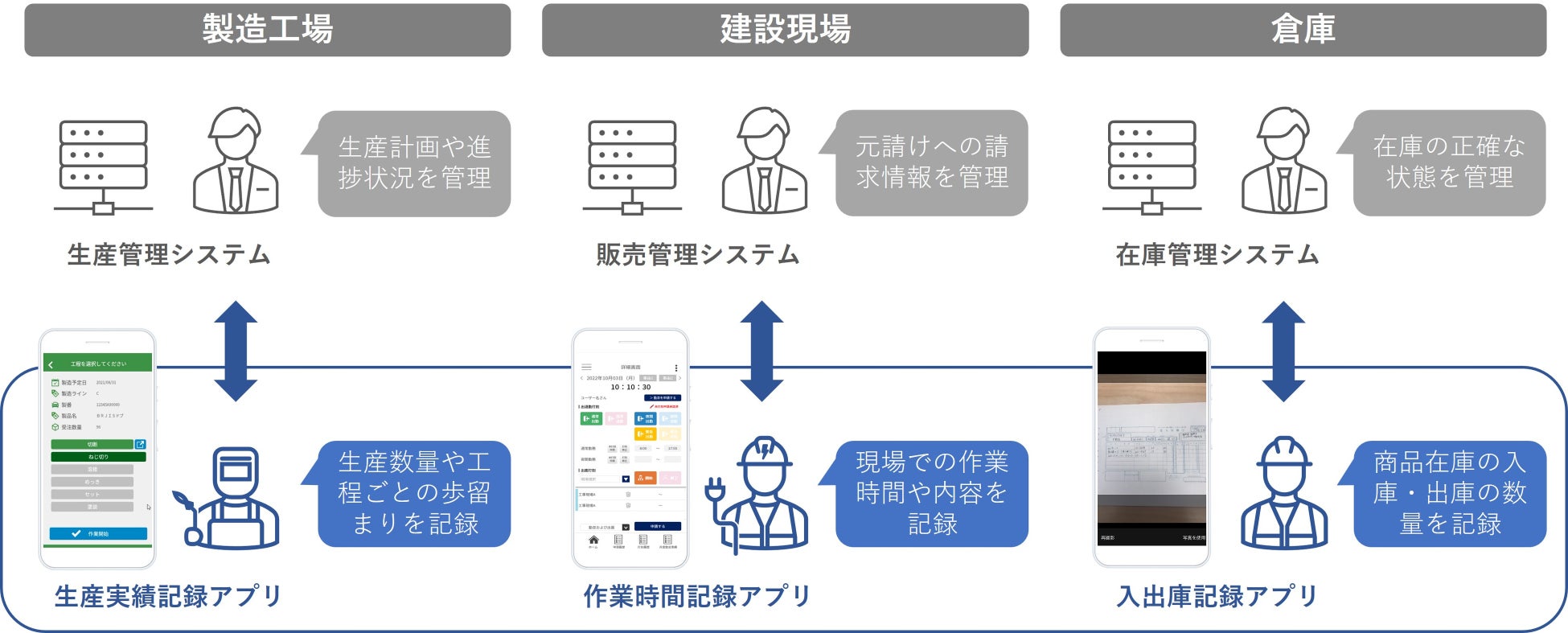 作成したモバイルアプリは、シンプルなユーザーインターフェイスで誰でもすぐに利用でき、またオフラインでも利用可能なため、製造工場の製造日報や建設現場の作業日報、各種点検報告書などアナログなままになっている現場の業務を一気にデジタル化できます。