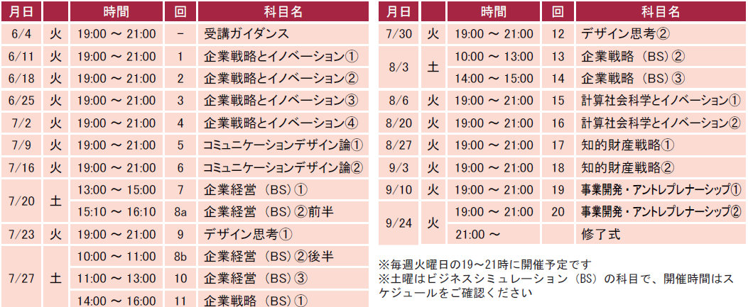 ①「企業戦略とイノベーション」「事業開発・アントレプレナーシップ」など、MOT(技術経営)のエッセンスを約4ヶ月間で学習