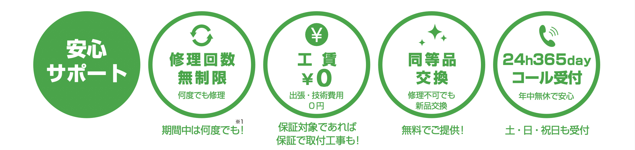 商品購入時に保証加入いただく事により、最長10年間修理回数無制限の無償修理と充実のサポートを