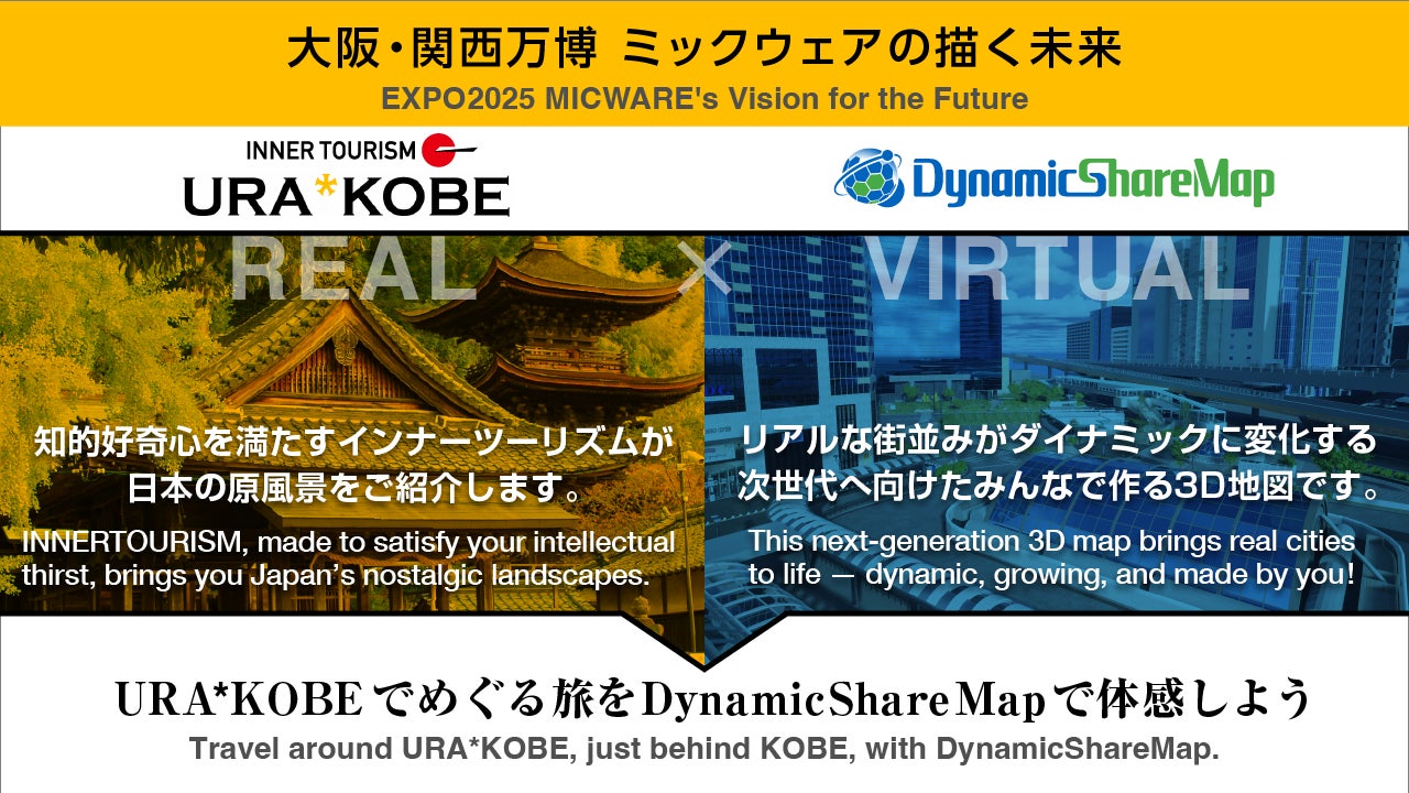 今回は神戸市北区を舞台に、地域の歴史や文化を探訪しながら、あなたの知的好奇心を刺激する旅「URA*KOBE by Inner Tourism」をご紹介します。ミックウェアの最新技術が可能にしたスーパーリアルな次世代3D地図サービス「Dynamic Share Map(DSM)」を活用したバーチャル空間で、実際の旅で訪れるルートの詳細や風景を万博会場に居ながらお楽しみいただけます。