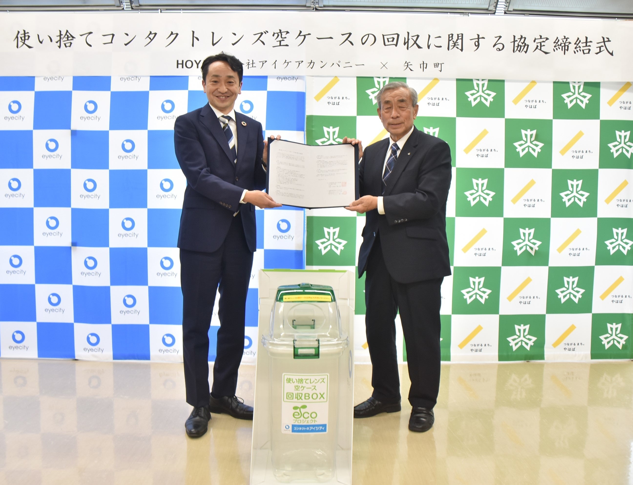 この協定内容は、HOYA株式会社 アイケアカンパニーが行う使い捨てコンタクトレンズ空ケース回収の取組について、岩手県紫波郡矢巾町が情報発信・回収活動を行い、町民の皆さんに広くプラスチックごみ削減と資源再生の意識を啓発していくというものです。世界で広がっている持続可能な SDGs 社会の実現への取り組みに、当社少しでも貢献できるよう、これからも「アイシティ eco プロジェクト」を推進していきます。