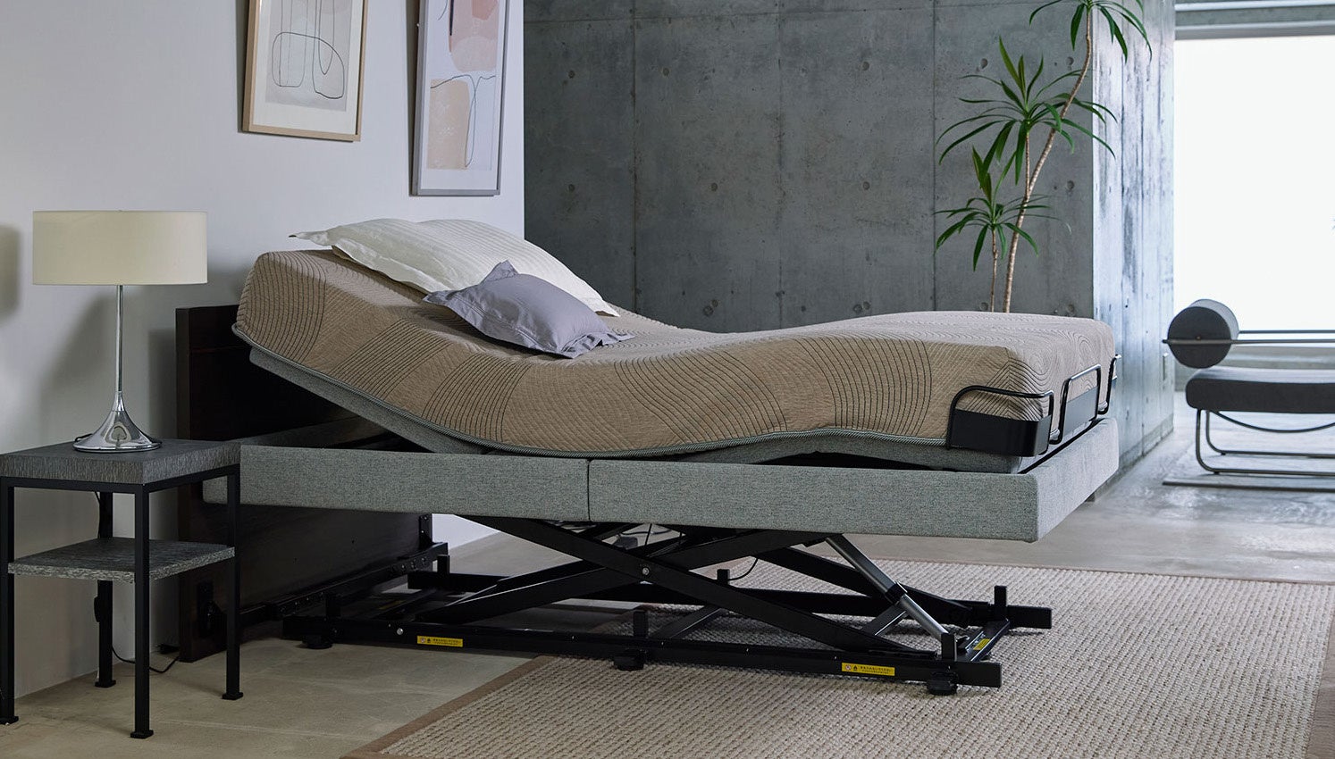背上げ、脚上げ、昇降の3モーター駆動。5タイプのマットレス。サイスはシングル、セミダブル。