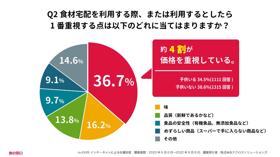 食材宅配を利用する上で最も重要視される点は「価格」で36.7%の割合でした。次いで「味」16.2%、「品質」13.8%でした。