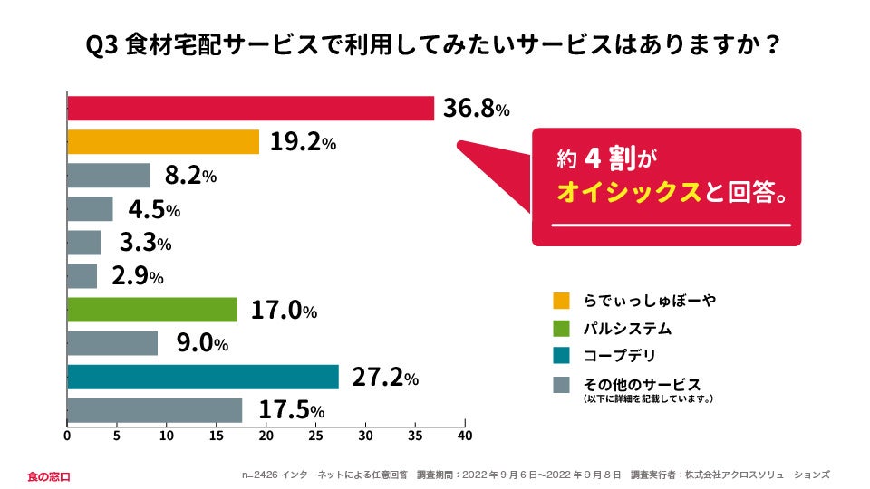 利用してみたい食材宅配サービスとして最も注目があったのは「オイシックス」で36.8%でした。次いで生協の「コープデリ」が27.2%でした。