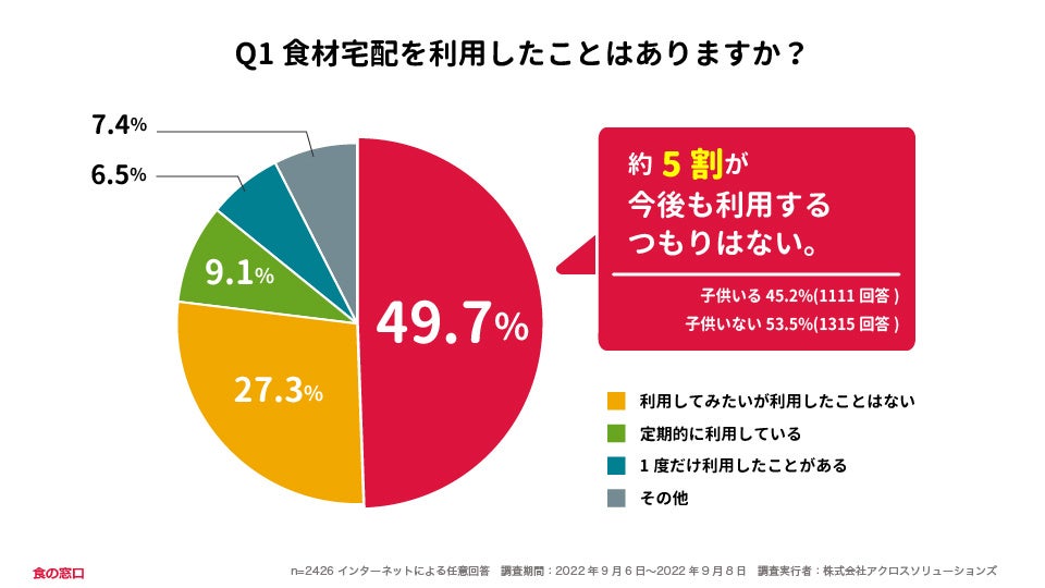 【2426人調査】約50%の人が食材宅配サービスを今後も利用するつもりがないと回答〜食材宅配に関する意識調査〜