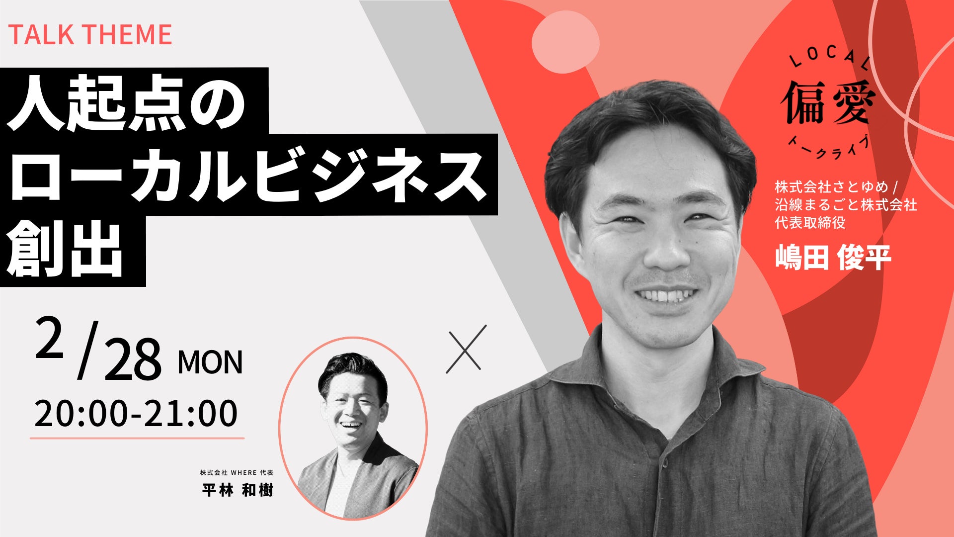 2月最後のトークライブを飾るのは、テレビ東京「ガイアの夜明け」でも紹介された「沿線まるごとホテル」をはじめ、全国約40エリアで地方創生事業のプロデュースを行う株式会社さとゆめの代表取締役・嶋田俊平さん。