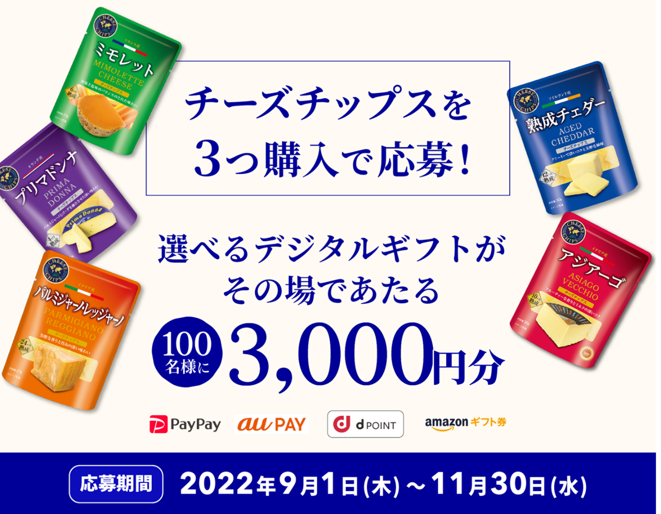チーズチップスを3つ購入したレシートを撮影してキャンペーンサイトで応募した人の中から抽選で計100名にギフト券3,000円分をプレゼント。