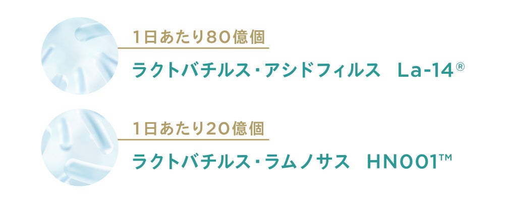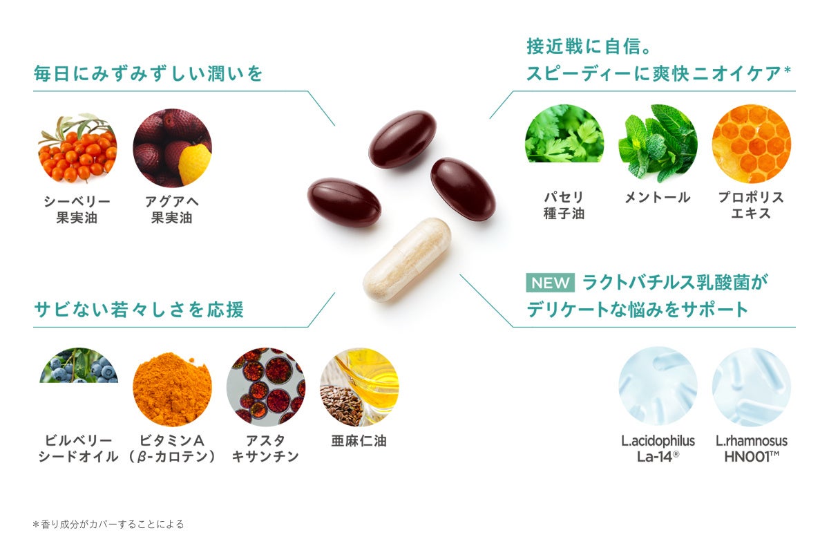 栄養豊富なスーパーフルーツ「シーベリー」と「アグアヘ」から抽出したオイルや、「β-カロテン(ビタミンA)」など11種の成分を厳選。生きて届くラクトバチルス 乳酸菌「La-14®︎」と「HN001™」が快適な健やかさに寄り添います。