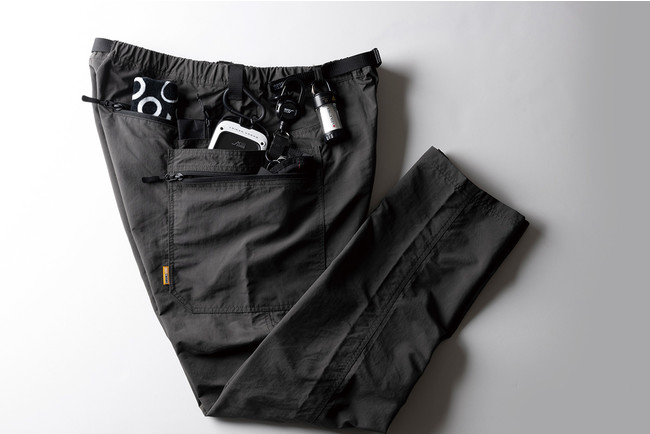 1)収納力抜群の合計9つのポケットを搭載、バッグ要らずのアウトドアギアパンツ