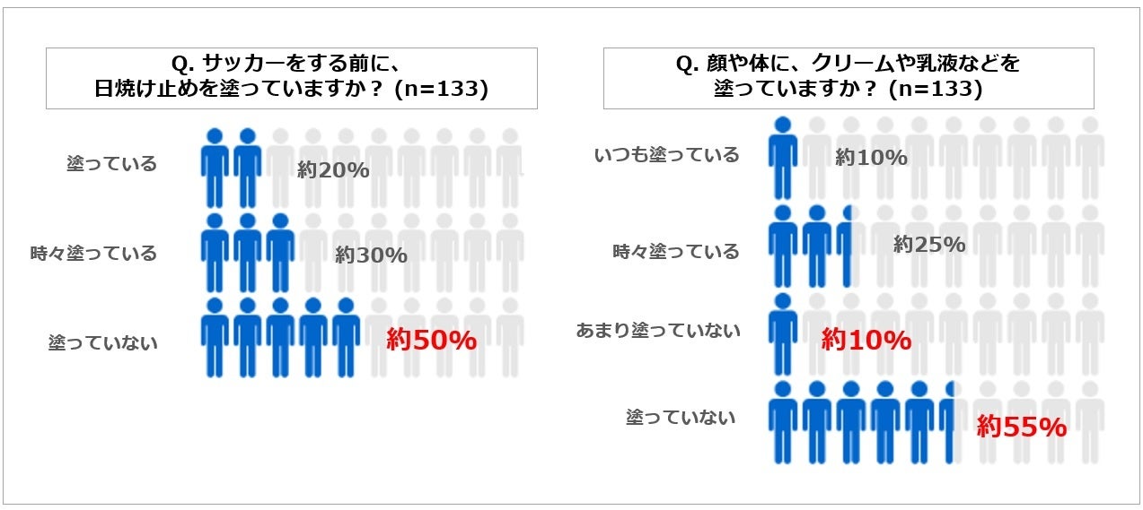 本研究では、小学1年生~6年生のスポーツキッズ133名を対象として、2022年7月~8月にwebアンケートを実施いたしました。皮膚状態(皮膚について悩んでいること、日焼けの程度)、スキンケア頻度、周囲の大人の関わり方(スキンケアについての声掛け頻度・ケア方法の教育の有無)等について調査し、日々サッカーに励むスポーツキッズの皮膚状態と生活習慣に関する実態を調べました。
