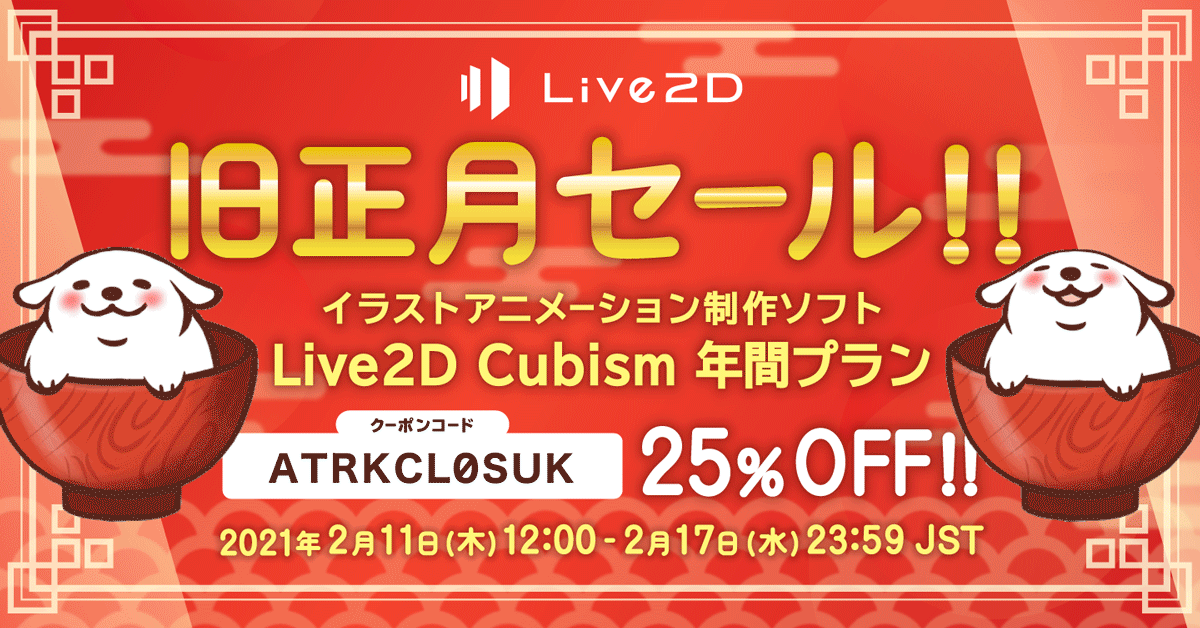 2Dイラストを立体的に動かすソフトウェア「Live2D Cubism(ライブツーディー キュビズム)」の開発・販売を行う株式会社Live2D(本社:東京都新宿区、代表取締役:中城哲也、以下、Live2D社)は、2021年2月11日(木)から2021年2月17日(水)までの7日間「Live2D旧正月セール」を開催します。『Live2D Cubism PRO 年間プラン』が25%OFFで購入できるお得なチャンスをお見逃しなく!