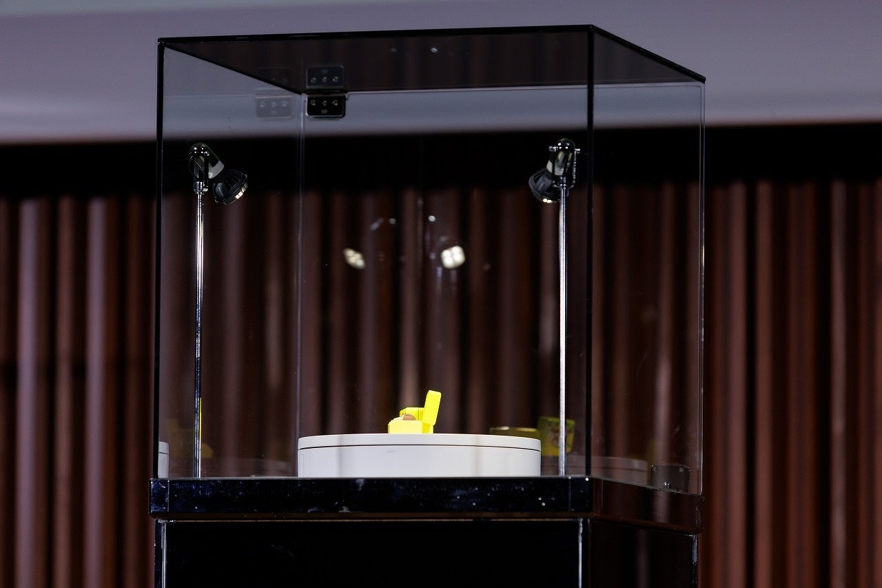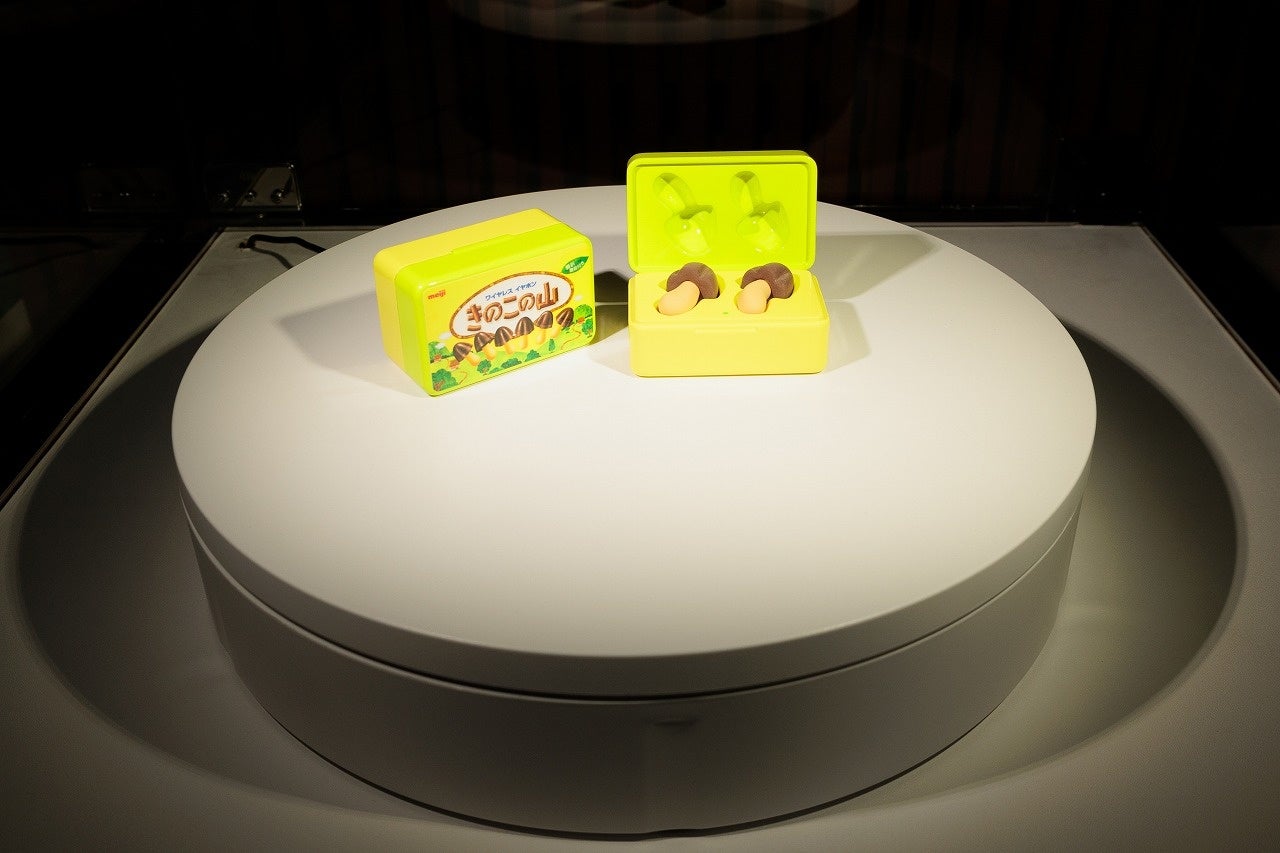 次に、グローバルに向けてのアクションを発表。第1歩として、16日から「浅草花やしき」で開催中の「きのこの山たけのこの里 Presents ASAKUSA NEXT ASIA FESTIVAL 2023」に冠協賛し、世界の人々に「きのこ、たけのこDOCCHI派を問うイベントを開催。さらに、以前公式X(旧Twitter)で話題となった「きのこの山」の形をした架空イヤホンを実際に「同時翻訳機能付きのこの山イヤホン」として商品化することを発表。本格的な機能の紹介と共に、実際にモックの展示などが行われました。その後、タレントの森崎ウィンさんなどから応援メッセージが紹介され、最後に萩原本部長より、「きのこの山」が発売して2025年で50周年を迎えるにあたり、世界各国で「どっち派?」旋風を巻き起こす『グローバル総選挙』を実施するという目標を語り、会場が大いに盛り上がりました。